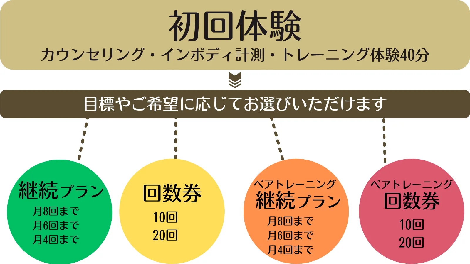 初回体験終了の当日中に継続プラン、回数券、ペア継続プラン、ペア回数券のいずれかをご購入の方は初回体験トレーニング料は無料といたします。(1回券を除く)